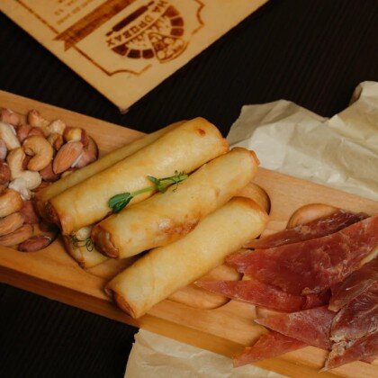 Крылышки баффало, картофель фри, мясные чипсы, луковые кольца, сыр фри "Камамбер", соус"Спайси", соус "Чесночный"